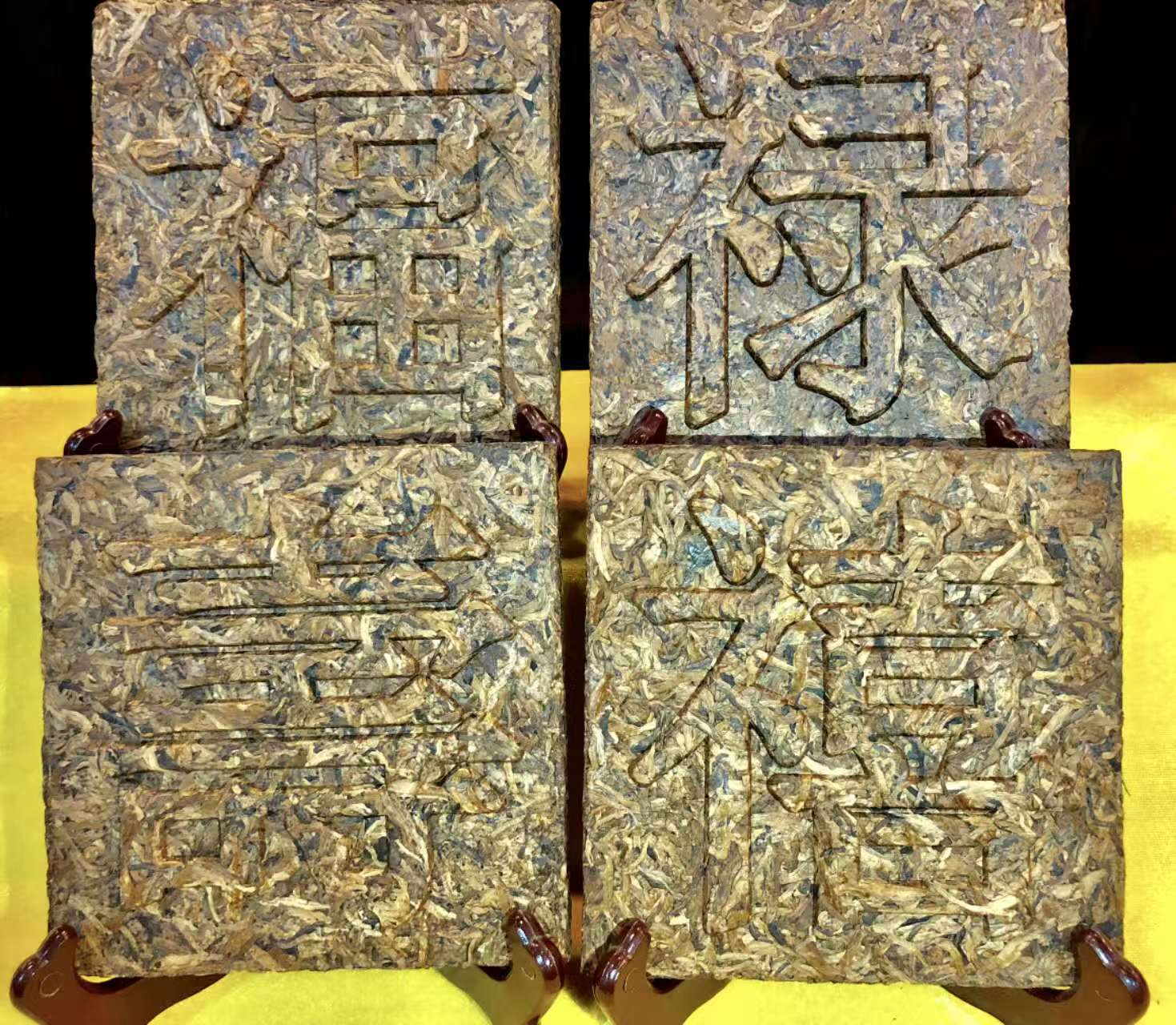 九十年代中茶,首批福禄寿禧,此款福禄寿禧茶砖是中茶历史以来首批压制的福禄寿禧,每片约500克,一套为四砖,正面分别印有福、禄、寿、禧,以野生乔木古树为原材料,茶经传统手工制作,条索具有立体感,茶干颜色黄油亮。福禄寿喜礼茶上品,用料十分考究,筛的是“宫廷”或421级别的料,这也是为什么它会叫云南贡茶。不仅卖相可观,它的内质也是佳品,茶条肥壮,纹理清晰。开汤冲泡出的汤色红润透亮,滋味醇厚,回甘持久,是一款难得的好茶。